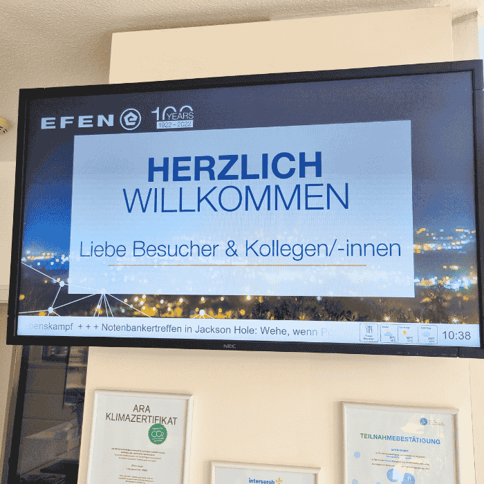 Seit unserem ersten Kontakt mit EFEN im Jahr 2016 haben wir eine enge, erfolgreiche Partnerschaft aufgebaut. Über die Jahre hinweg haben wir EFEN kontinuierlich in ihrer Weiterentwicklung begleitet, indem wir spezifische Lösungen für ihre Anforderungen bereitgestellt haben – darunter die Lieferung verschiedener Signage Hardware, unsere Software - Display Star, sowie maßgeschneiderte Vorlagen für diverse Abteilungen.