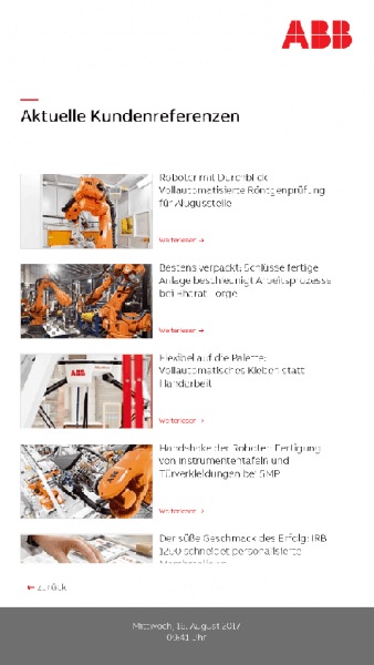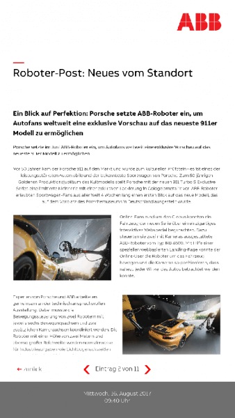 2016 erhielt die ABB Group, ein international führender Anbieter im Bereich Robotik und Antriebe, von der komma,tec redaction ein Mitarbeiterinformationssystem, um die interne Kommunikation effizienter zu gestalten und eine größere Reichweite unter den Mitarbeitenden zu erreichen. Ein Redesign des Mitarbeiterinformationen-Templates folgte 2017, um das Erscheinungsbild und die Benutzerfreundlichkeit weiter zu optimieren.