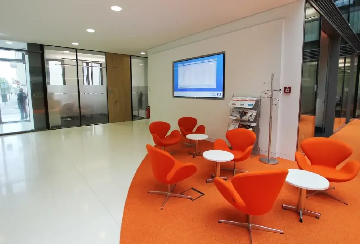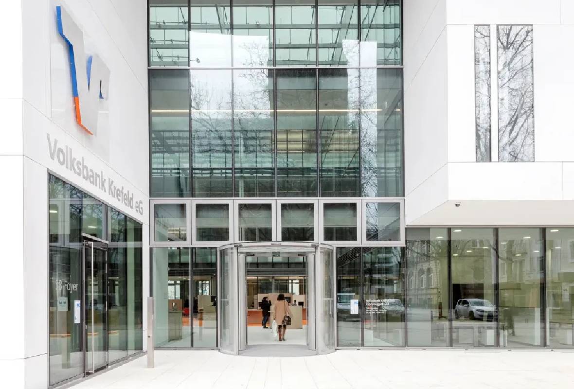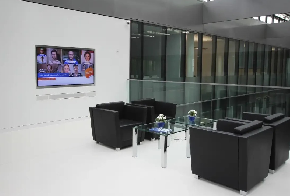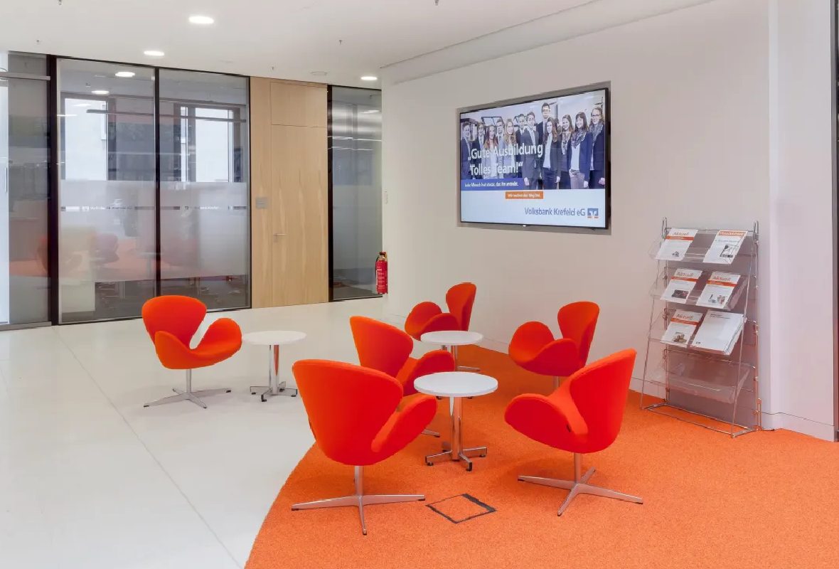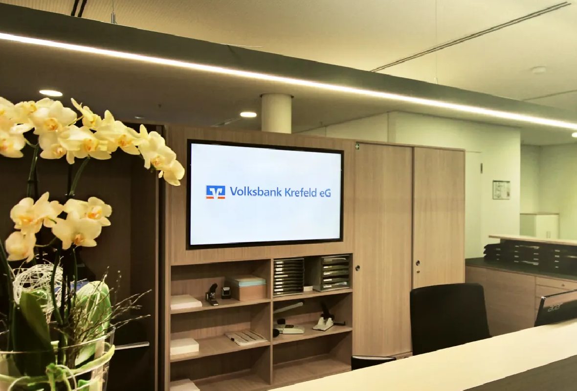 In der Hauptverwaltung der Volksbank Krefeld wurde eine durchgängige Digital Signage Lösung etabliert, die den Eingangsbereich, Wartebereiche sowie Informations- und Werbeflächen dynamisch bespielt. Überall im Gebäude informieren Displays nicht nur über Bankprodukte und Termine, sondern verkürzen Wartezeiten durch spannende Inhalte und schaffen ein modernes Kommunikationsumfeld.