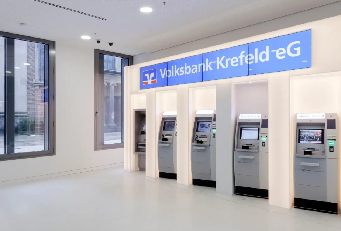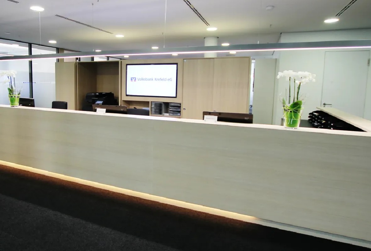 Die Volksbank Krefeld ist eine regional verankerte Genossenschaftsbank mit starkem Kundenfokus. Sie verfolgt das Ziel, ihren Kund:innen einen modernen Bankauftritt zu bieten, in dem digitale Kommunikation und Service intelligent kombiniert werden. In der neuen Hauptverwaltung setzte die Bank gezielt auf Digital Signage, um Kunden, Mitarbeitende und Besucher gleichermaßen besser zu informieren und das Markenimage zu stärken.